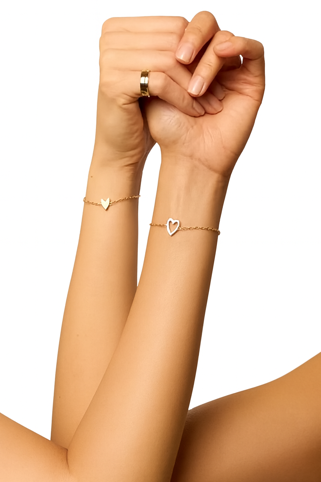 es una pulsera diseñada para capturar la esencia de los lazos que perduran. Su acabado en baño de oro pulido a mano aporta un brillo cálido y sofisticado que eleva cualquier look. El diseño minimalista de corazones entrelazados simboliza una conexión profunda, auténtica y eterna. Gracias a su ajuste deslizante, se adapta con precisión y comodidad a cualquier muñeca. Una pieza que combina significado y elegancia, creada para acompañarte en los momentos que realmente importan.